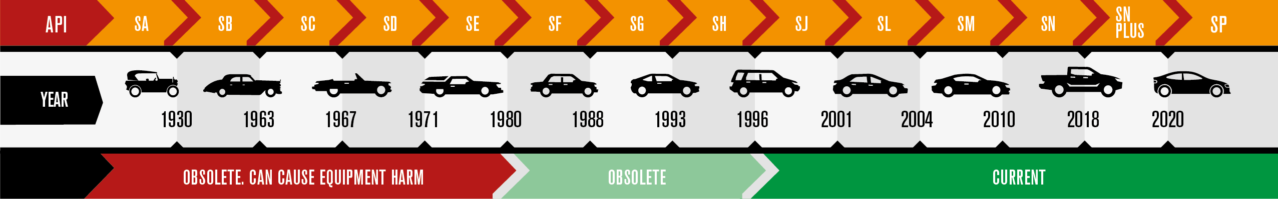 Al seleccionar el aceite adecuado para su vehículo, tenga en cuenta su año de fabricación. Los aceites modernos pueden no ser compatibles con los diseños de motor más antiguos. Las especificaciones de SA a SH son obsoletas y están pensadas para motores fabricados a partir de 1995. Como ya se ha explicado, las especificaciones más recientes tienen letras más altas y sustituyen a las antiguas. API SP a SJ son para coches más nuevos, mientras que API SH a SA son para coches más antiguos.