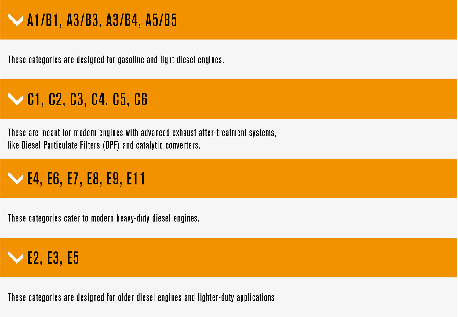 - C1, C2, C3, C4, C5, C6: These are meant for modern engines with advanced exhaust after-treatment systems, like Diesel Particulate Filters (DPF) and catalytic converters. Oils in these categories use low-ash formulations to protect these systems and ensure compliance with modern emissions standards. The C6 category, in particular, was introduced to combat Low-Speed Pre-Ignition (LSPI) and turbocharger fouling, which are common issues in direct-injection engines.