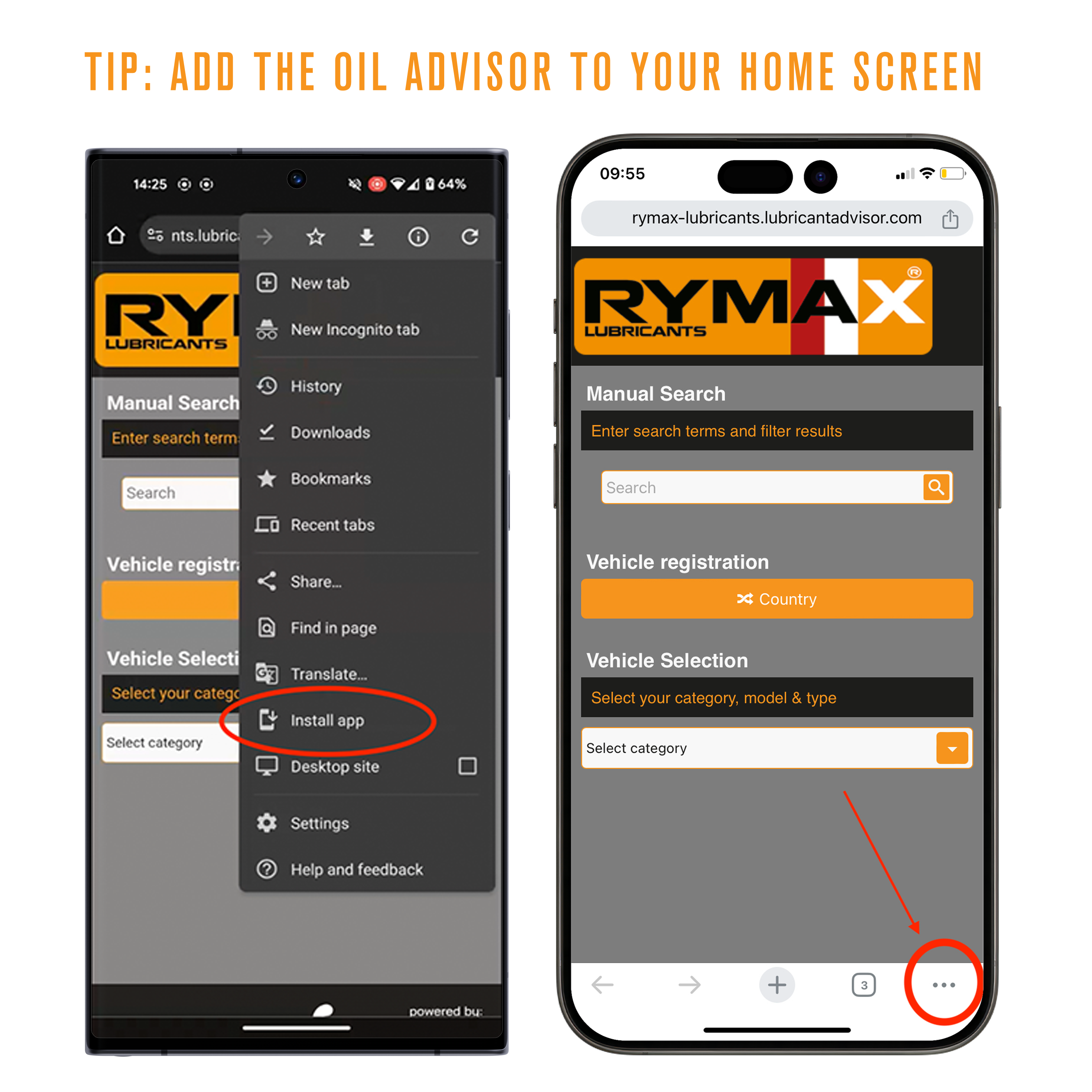 And here's a handy tip: You can also add the Rymax Lubricants Oil Advisor to your phone's home screen for quick and easy access. Once on the Rymax Oil Advisor page in your phone browser, Android users can click on the three dots in the top right corner of the screen and select "Install app." If you're an iOS user, click on the boxed arrow button in the middle of the bottom tab and then select "Add to home screen."